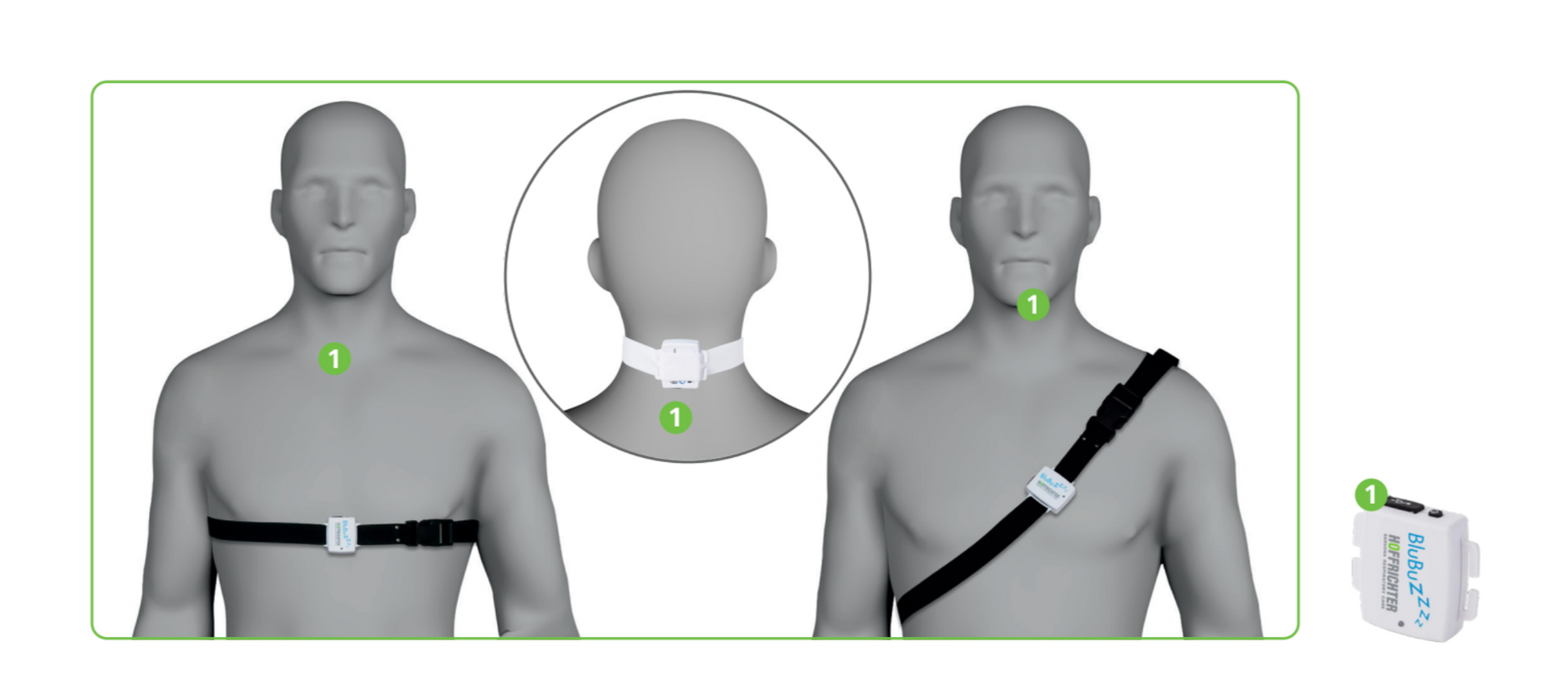 HOFFRICHTER BluBuzz ist ein Schlafpositionstrainer, der die Rückenlage erkennt. Er wird während des Schlafs getragen,